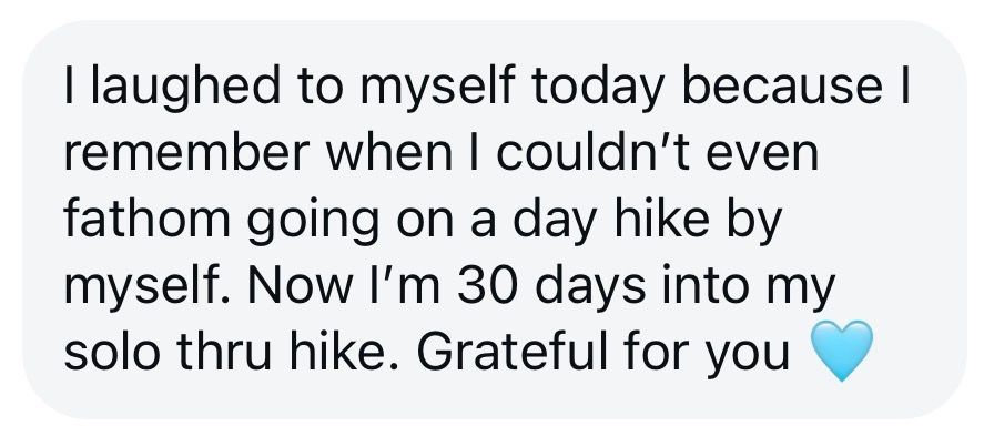 When I saw Stevie post about MBP, it was like a spark — I knew this was what l'd been looking for. A program built for people like me: dreamers who are ready to do the work. It offered coaching in strength training for backpacking, mental resilience, gear guidance, nutrition, and so much more. I didn't hesitate - I reached out, and I'm so glad I did.
